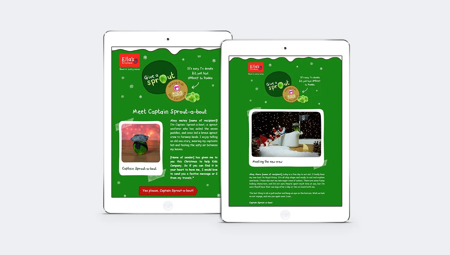 The ‘Give a Sprout’ campaign asks families to adopt a virtual sprout to raise a smile and funds for children’s charity Kids Company. The campaign plays on the idea that sprouts are ignored and left behind on dinner plates. The tongue-in-cheek campaign gives the sprouts their own personality and asks people to give sprouts a home this Christmas.